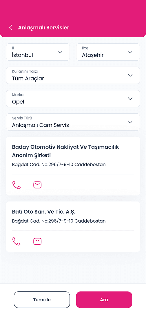 Size en yakın anlaşmalı servisimizi kolayca bulun, yol tarifi alın. Anlaşmalı servisimizin adres, telefon ve e-posta bilgilerine mobil uygulamamız üzerinden kolayca ulaşın.